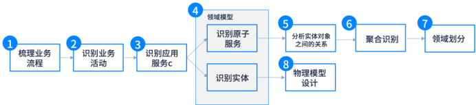 领域驱动设计(Domain-Driven Design, DDD)是一种面向对象的软件开发方法论,它强调的是深入理解和反映业务领域的需求,通过与业务专家的密切合作来构建出既符合业务逻辑又具备高度灵活性的软件架构;DDD通过定义清晰的领域模型,确保软件能够准确地表达业务规则,并通过限界上下文的概念来管理复杂性,将不同的业务功能和责任区域划分开来,从而在保证系统一致性的同时,也提高了模块间的解耦能力,这样不仅提升了软件的可维护性和扩展性,还通过共同语言(Ubiquitous Language)促进了开发团队与业务专家之间的有效沟通,最终实现了业务与技术的高度融合。同时基于领域驱动设计所设计出来的软件能够更好的符合现在云上的微服务化部署。基于领域驱动设计的应用设计步骤如下图所示: