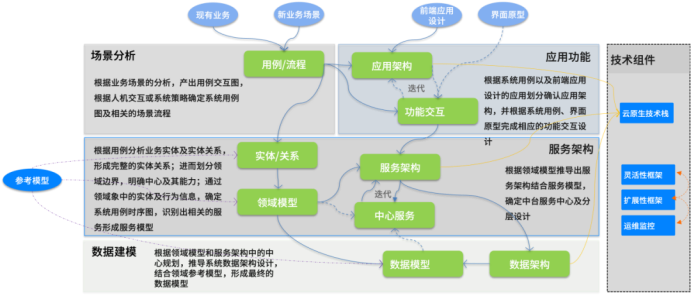 采用阿里中台方法论AEPM (Alibaba Enabling Platform Methodology)进行业务中台设计。AEPM是阿里经过大规模实践的组装式企业建设与治理方法,业务中台是企业智慧中台的重要组成部分,它通过对各业务中共性的流程与应用进行合并、抽象,实现对企业业务全链路流程能力的整合,并将公共业务能力以服务的方式向前端输出,快速响应业务需求,全面提升前端业务作战以及业务支撑的效率。