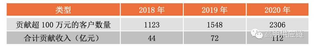 京东一不小心成为了供应链综合解决方案的头部,其客户数量增长很快。从2018年~2020年短短的三年时间,贡献100万元的客户数量翻番,这使得京东积累了大量的客户实践经验,而这些沉淀的行业Know-how得以固化,支撑京东的解决方案的提升、电商SaaS的优化、大模型的开发。
