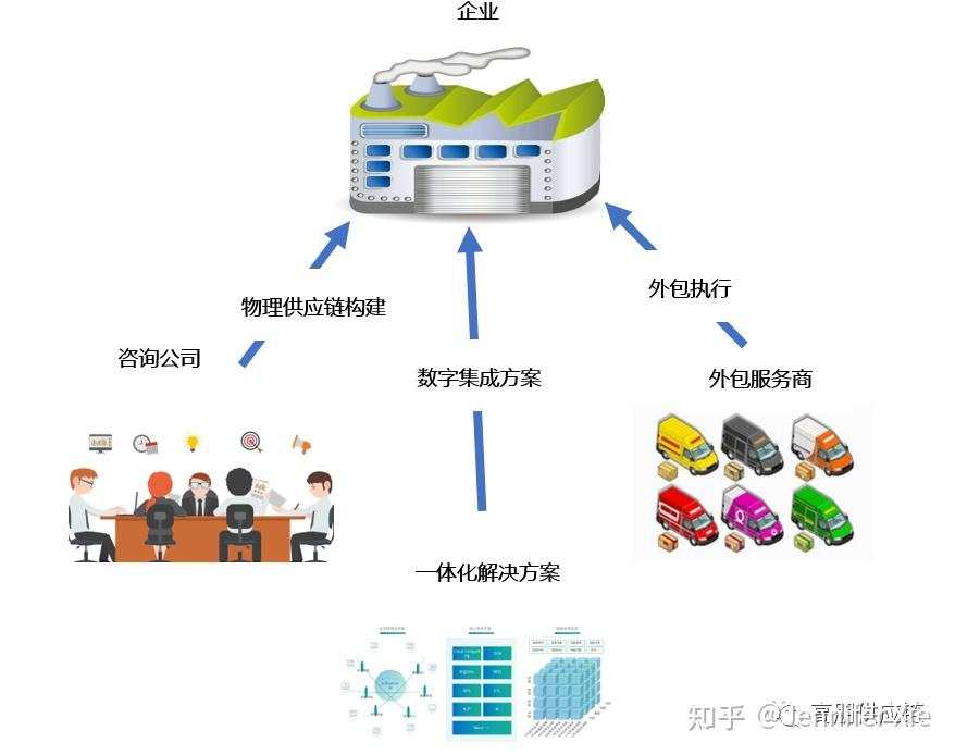 即:终极状态下企业内部没有供应链职能,但是市场上会有专业的供应链解决方案咨询公司,那时候市场上大致会有这几类企业存在:管理咨询公司+解决方案商+专业模块外包服务商。管理咨询公司就是提供供应链管理相关的咨询和服务,帮助企业搭建物理的供应链,然后数字化系统方案商、机器人自动化解决方案商等方案商则需要为企业设计管理方案。那么类似于生产、物流等则需要由专业的第三方外包服务商来承担执行。