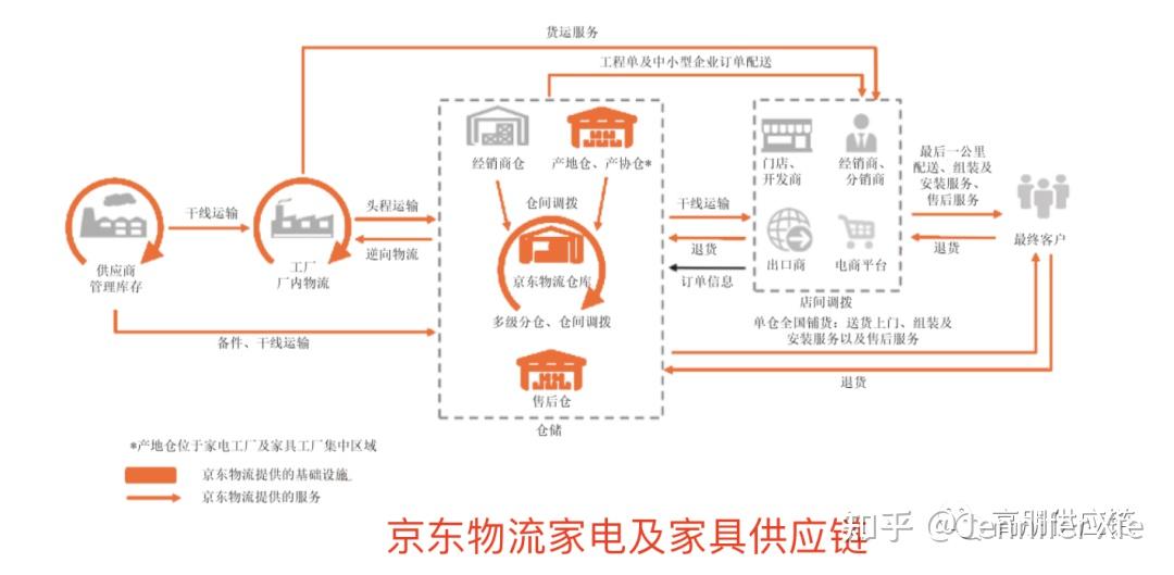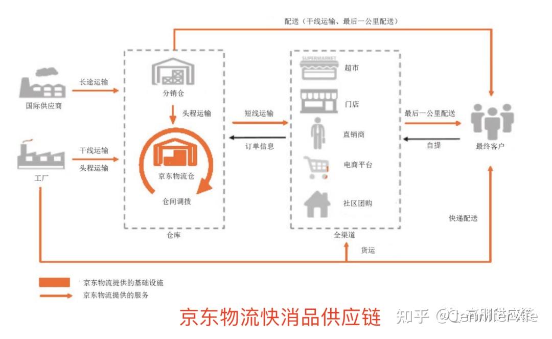 从上图来看,京东为客户提供的服务有:从工厂到目的市场的头程运输、从京东物流仓库到全渠道分销仓库;从渠道到客户的最后一公里的配送。